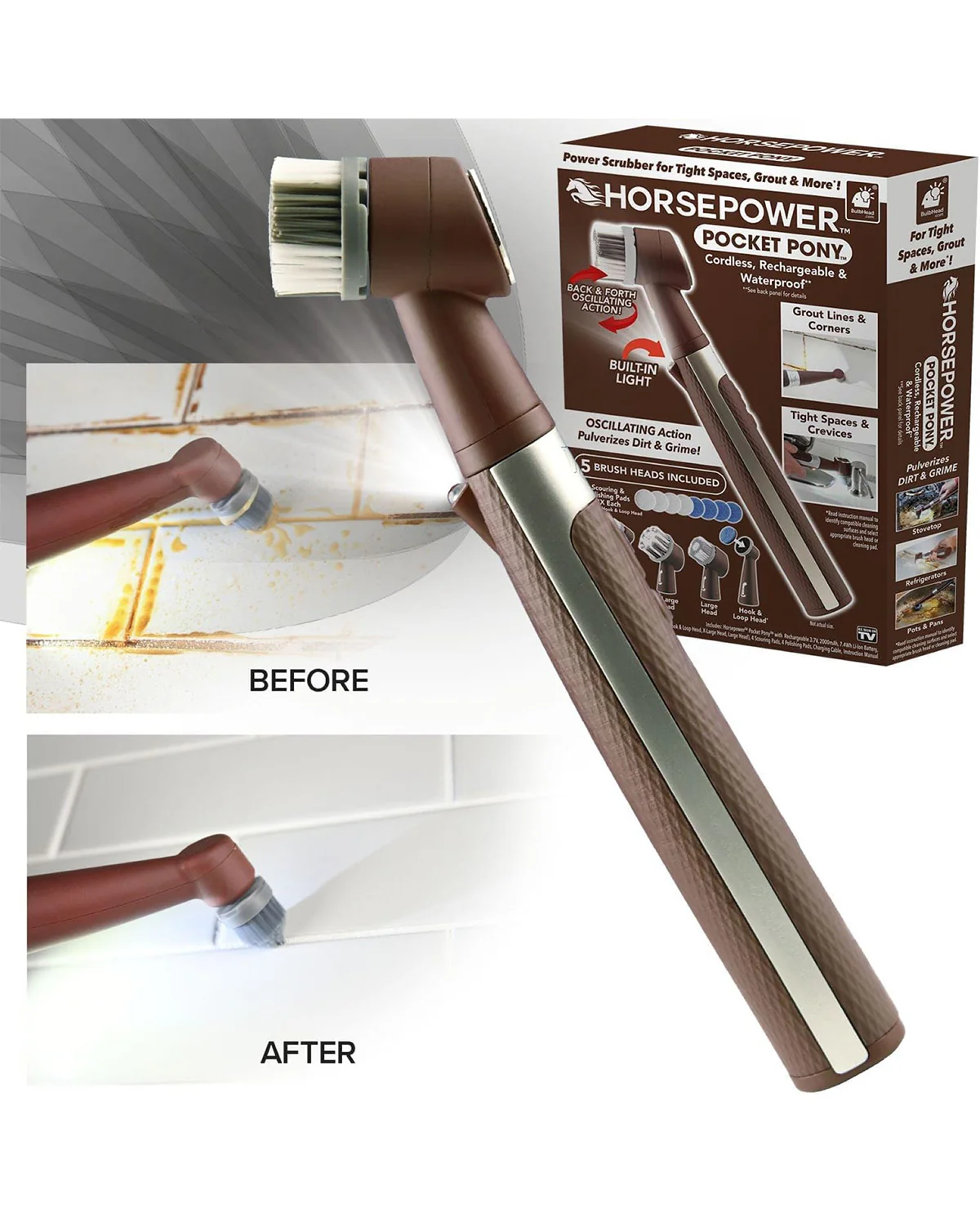 - VERSATILE CLEANING REACH: The Pocket Pony adapts to every cleaning challenge with five interchangeable brush heads. From grout lines and corners to wide surfaces, no mess is too tough or area too small for this versatile tool